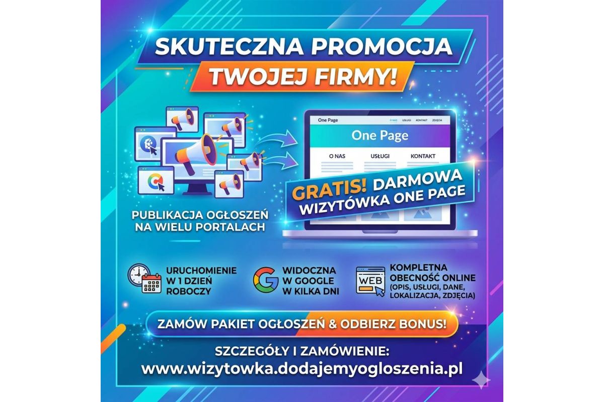 Szukasz skutecznej promocji swojej firmy w internecie? Zamów pakiet publikacji ogłoszeń na wielu portalach - a w ramach bonusu otrzymasz profesjonalną wizytówkę internetową One Page zupełnie za darmo!